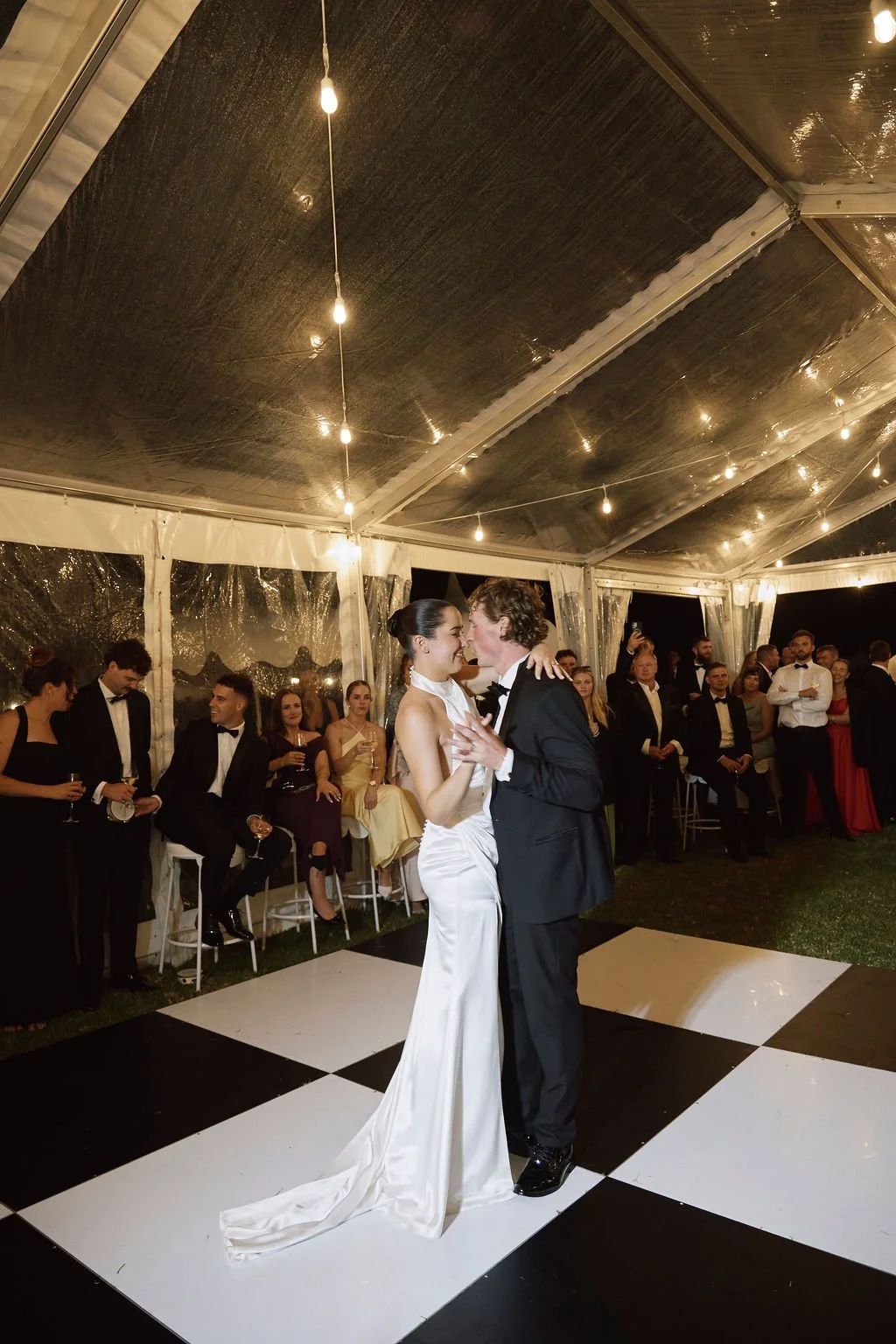Our Pavilion Marquees aren’t just functional — they’re genuinely beautiful. With their classic white frames, clear roof panels, and elegant draping, they become a considered part of your wedding design rather than an afterthought. Add festoon lighting strung through the rafters, a black-and-white dance floor, and your florals, and the marquee becomes one of the most stunning spaces on your property.